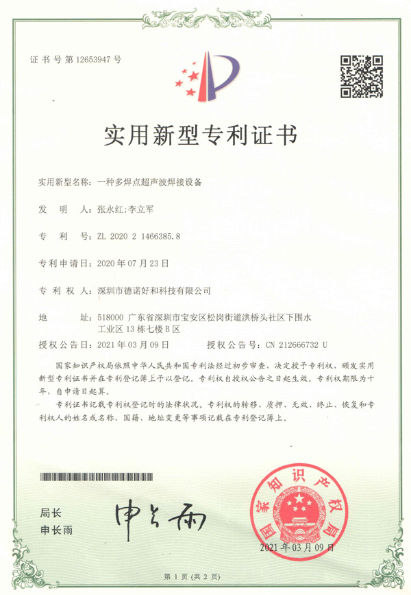 一种多焊点超声波焊接设备(实用新型专利证书)