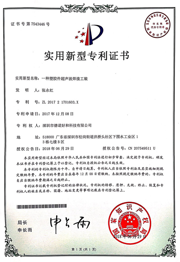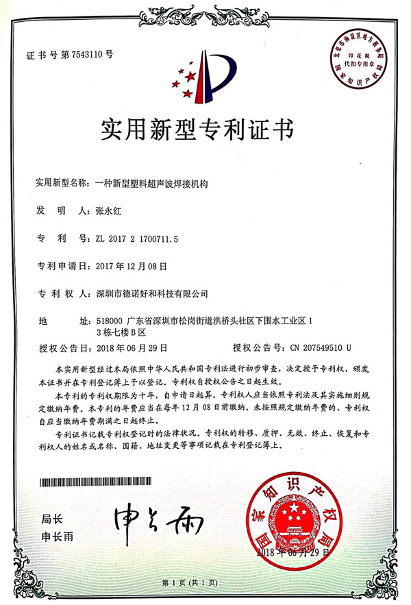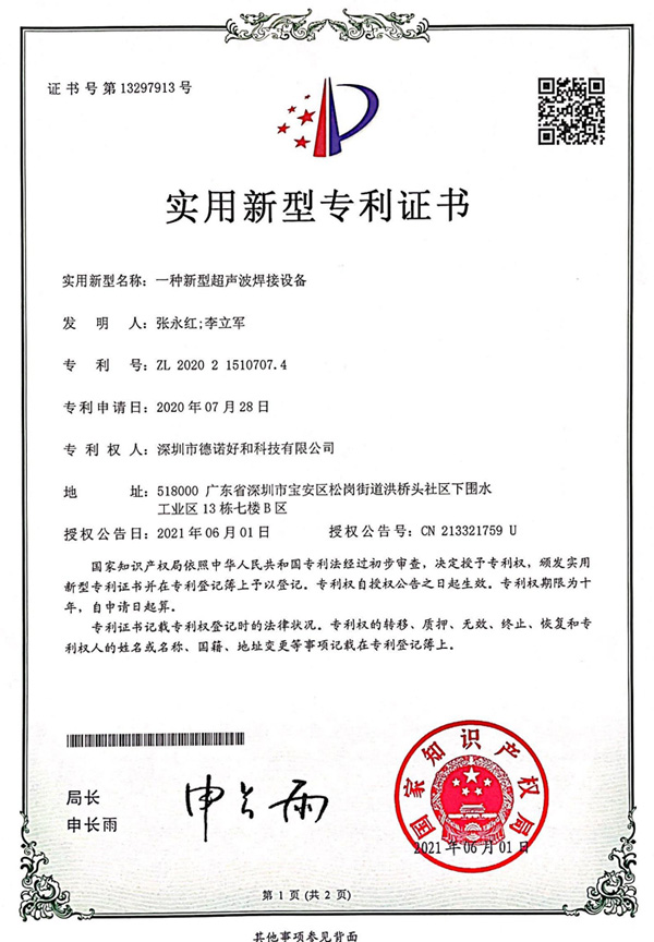 一种新型超声波焊接设备(实用新型专利证书)